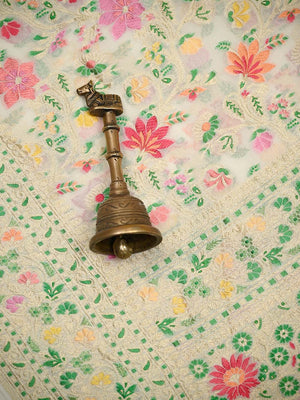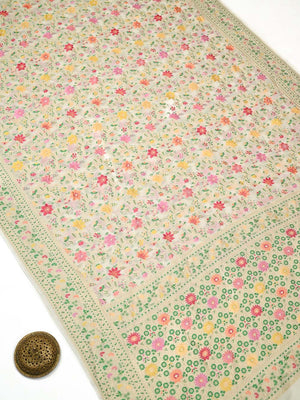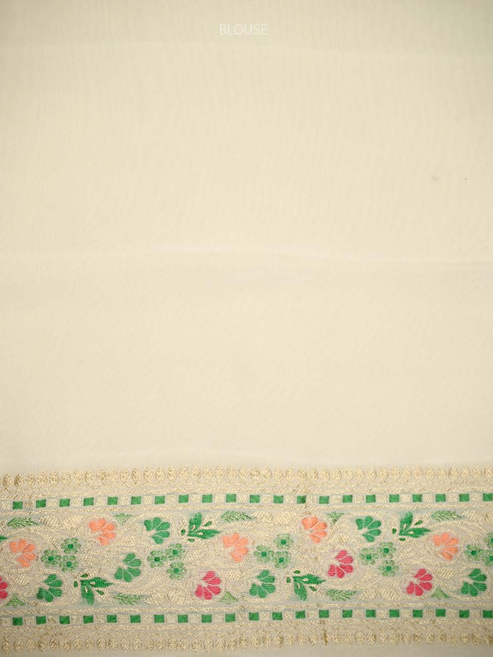 Pure khaddi georgette with meenakari work in beautiful colors and classic zari weave. Meenakari is an artistic tradition passed down through generations. It's a beautiful Melange of Resham and Zari during the weaving process. This Beautiful cream saree has a multicolor jaal on the entire body with a zari border and pallu. It's a lightweight saree which looks stunning after drape.