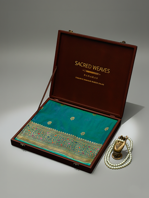 Pure Katan silk saree in blue green color. It features a Paithani border and a Paithani pallu in gold zari. The beautiful blouse adds to the elegance of the saree. The fabric has a soft feel. It's a classic traditional Banarasi saree apt for all celebrations.