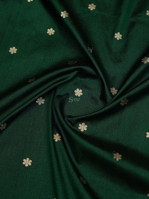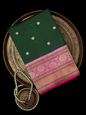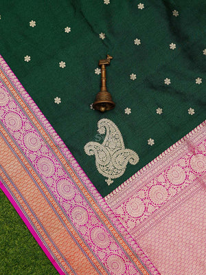 Pure tussar silk sarees by Sacred Weaves in bottle green color. It has a beautiful gold zari contrast broad border and gold zari booti all over. This charming handwoven tussar saree in the daintiest of hues and beguiling zari work is apt for all celebrations. The Saree looks stunning and captivating on the drape.