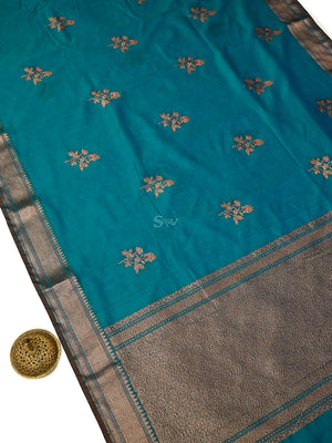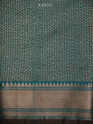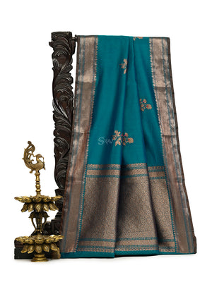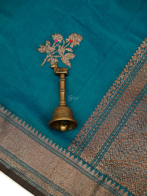 Chanderi Silk, Evergreen & Timeless Sarees that evoke festivity & Joy. Classic motifs featured on silk makes it a splendid drape. Bringing your finest weaves from Banaras in green blue color. The Saree looks stunning and captivating on drape. It's a classic traditional saree apt for all celebrations.