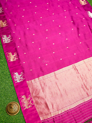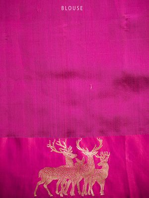 This elegant magenta pure silk saree offers a lightweight and comfortable drape, making it an ideal choice for festivals and weddings. It features exquisite animal motifs along the border and a striking gold zari pallu, blending traditional craftsmanship with understated sophistication. The saree’s vibrant hues and minimalistic design create a graceful, refined look suitable for special occasions.