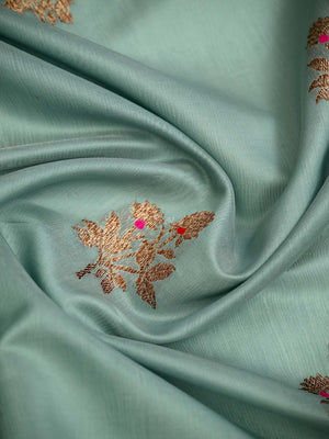 Chanderi Silk, Evergreen & Timeless Sarees that evoke festivity & Joy. Classic motifs featured on silk makes it a splendid drape. Bringing your finest weaves from Banaras in mint green color. The Saree looks stunning and captivating on drape. It's a classic traditional saree apt for all celebrations.