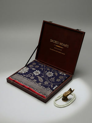 This navy blue Katan silk Banarasi saree features exquisite Sona Roopa zari work and a matching border. The soft fabric drapes effortlessly for all-day comfort. A true handloom masterpiece combining traditional craftsmanship with practical elegance, perfect for festivals and celebrations.