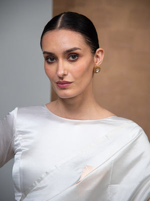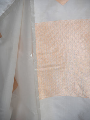 This elegant off-white saree is a highlight of the season, crafted to be a treasured heirloom for generations. Featuring exquisite gold zari embellishments with detailed artistry throughout, it exudes refined glamour. This handwoven Banarasi silk saree is a timeless symbol of classic luxury and sophistication.