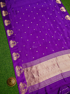 This elegant purple pure silk saree offers a lightweight and comfortable drape, making it an ideal choice for festivals and weddings. It features exquisite animal motifs along the border and a striking gold zari pallu, blending traditional craftsmanship with understated sophistication. The saree’s vibrant hues and minimalistic design create a graceful, refined look suitable for special occasions.
