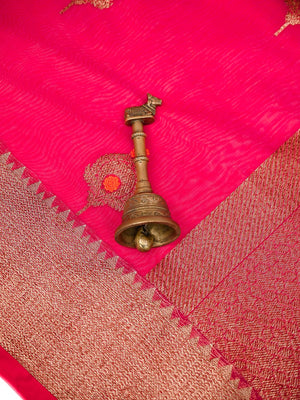 Chanderi Silk, Evergreen & Timeless Sarees that evoke festivity & Joy. Classic motifs featured on silk makes it a splendid drape. Bringing your finest weaves from Banaras in Red Pink color. The Saree looks stunning and captivating on drape. It's a classic traditional saree apt for all celebrations.