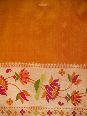 Pure Katan silk saree in yellow color. It has Paithani border and pallu in Gold zari. The beautiful blouse adds to the elegance of the saree. The fabric has a soft feel. It's a classic traditional Banarasi saree apt for all celebrations.
