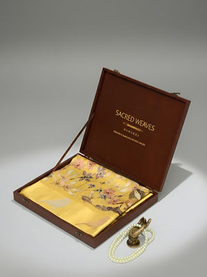 This elegant yellow pure silk saree boasts vibrant digital floral designs & exquisite bird motifs, along with a striking gold zari pallu and satin silk border. Its lightweight, comfortable drape and vibrant hues make it perfect for festivals & weddings, blending traditional craftsmanship with understated sophistication.