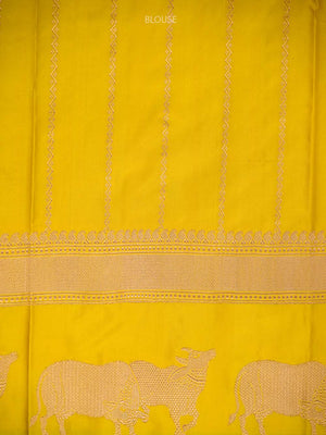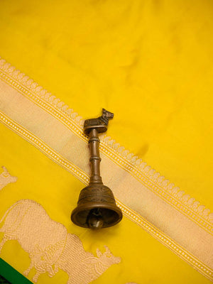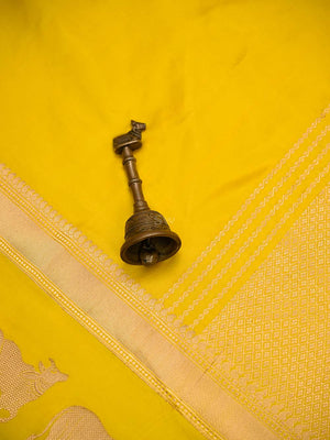 Celebrate in style with this yellow handloom Banarasi saree in pure silk. Its lightweight fabric drapes beautifully while showcasing intricate animal motifs on the contrasting border and a magnificent Sona-roopa Pallu. Ideal for weddings and festivals, this saree combines traditional artistry with understated elegance for memorable occasions.