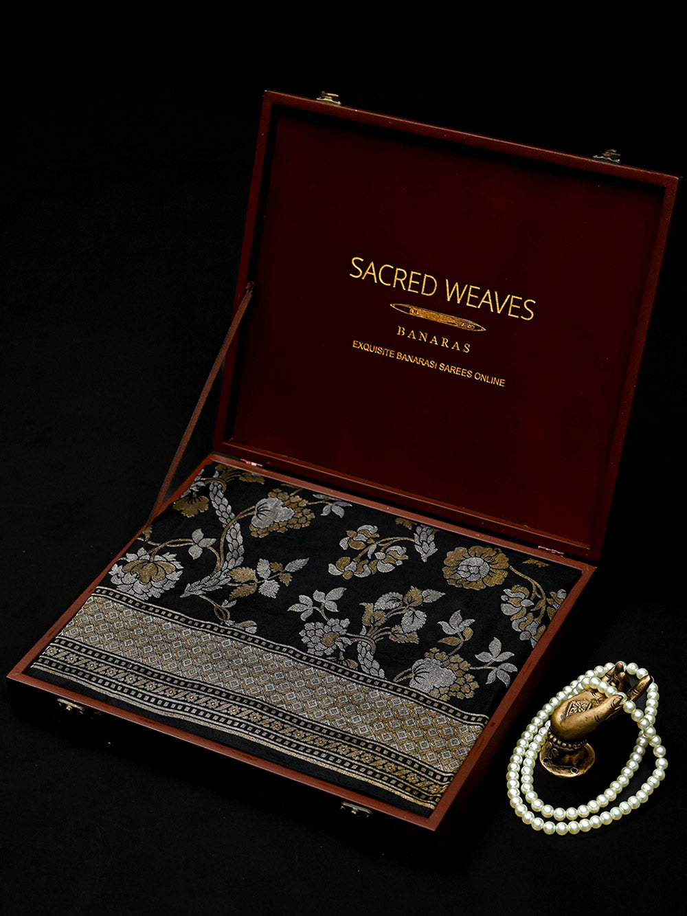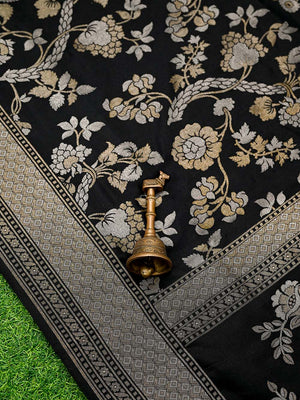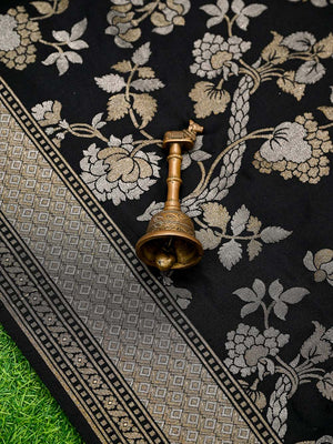 This black Katan silk Banarasi saree features exquisite Sona Roopa zari work and a matching border. The soft fabric drapes effortlessly for all-day comfort. A true handloom masterpiece combining traditional craftsmanship with practical elegance, perfect for festivals and celebrations.