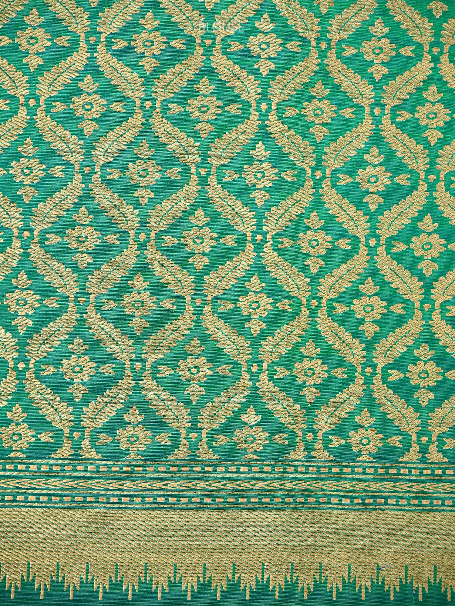 Pure Katan silk saree in blue greencolor. It features a Paithani broad border and a Paithani pallu in gold zari. The beautiful blouse adds to the elegance of the saree. The fabric has a soft feel. It's a classic traditional Banarasi saree apt for all celebrations.