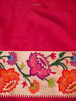 Pure Katan silk saree in dark pink color. It features a Paithani broad border and a Paithani pallu in gold zari. The beautiful blouse adds to the elegance of the saree. The fabric has a soft feel. It's a classic traditional Banarasi saree apt for all celebrations.