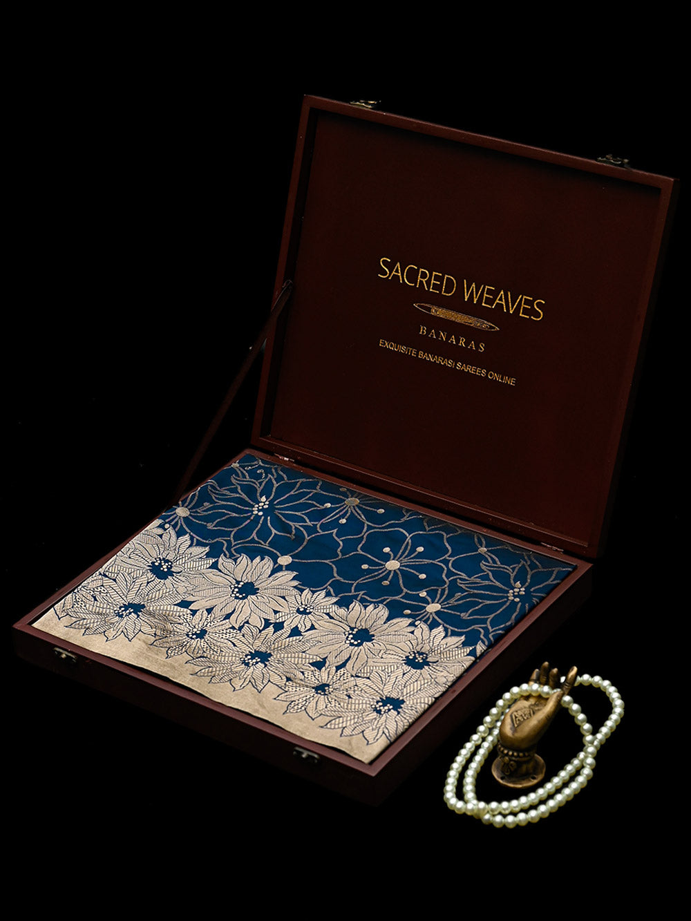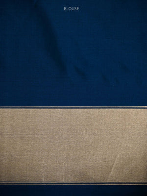 This Pure navy blue Katan Silk Handloom Banarasi Saree brings together traditional craftsmanship and modern style. Made from soft, luxurious silk, it features beautiful dull gold zari floral patterns woven throughout the fabric. The broad zari border adds a touch of grandeur, while delicate floral outlines on the body give it a contemporary feel. Perfect for special occasions, this saree combines the timeless elegance of Banarasi weaving with a fresh, modern twist that appeals to today's fashion-conscious wearer.