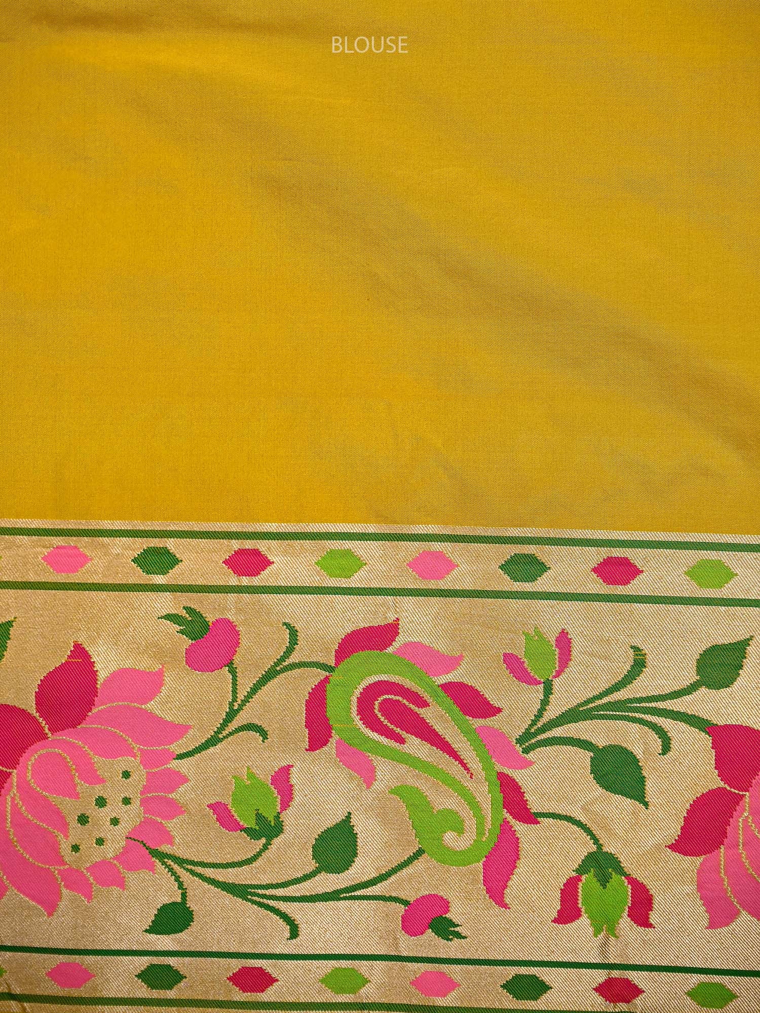 Pure Katan silk saree in yellow color. It features a Paithani broad border and a Paithani pallu in gold zari. The beautiful blouse adds to the elegance of the saree. The fabric has a soft feel. It's a classic traditional Banarasi saree apt for all celebrations.