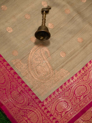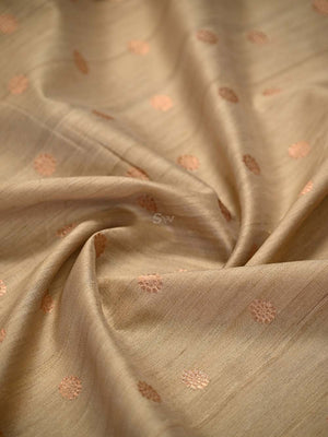 Pure tussar silk sarees by Sacred Weaves in beige color. It has a beautiful gold zari contrast, broad border, and gold zari booti all over. This charming handwoven tussar saree in the daintiest of hues and beguiling zari work is apt for all celebrations. The Saree looks stunning and captivating on the drape.