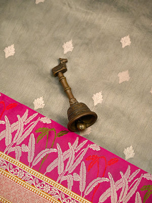 One of our stunning saree in gorgeous beige color this season. It's a luxury to be passed on to generations. Beautiful gold zari booti all over with intricate detailing adds glamour to the saree. Contrast gold zari border and breathtaking pallu bring the best of Indian weaving heritage. It's an elegant classic handwoven luxury.