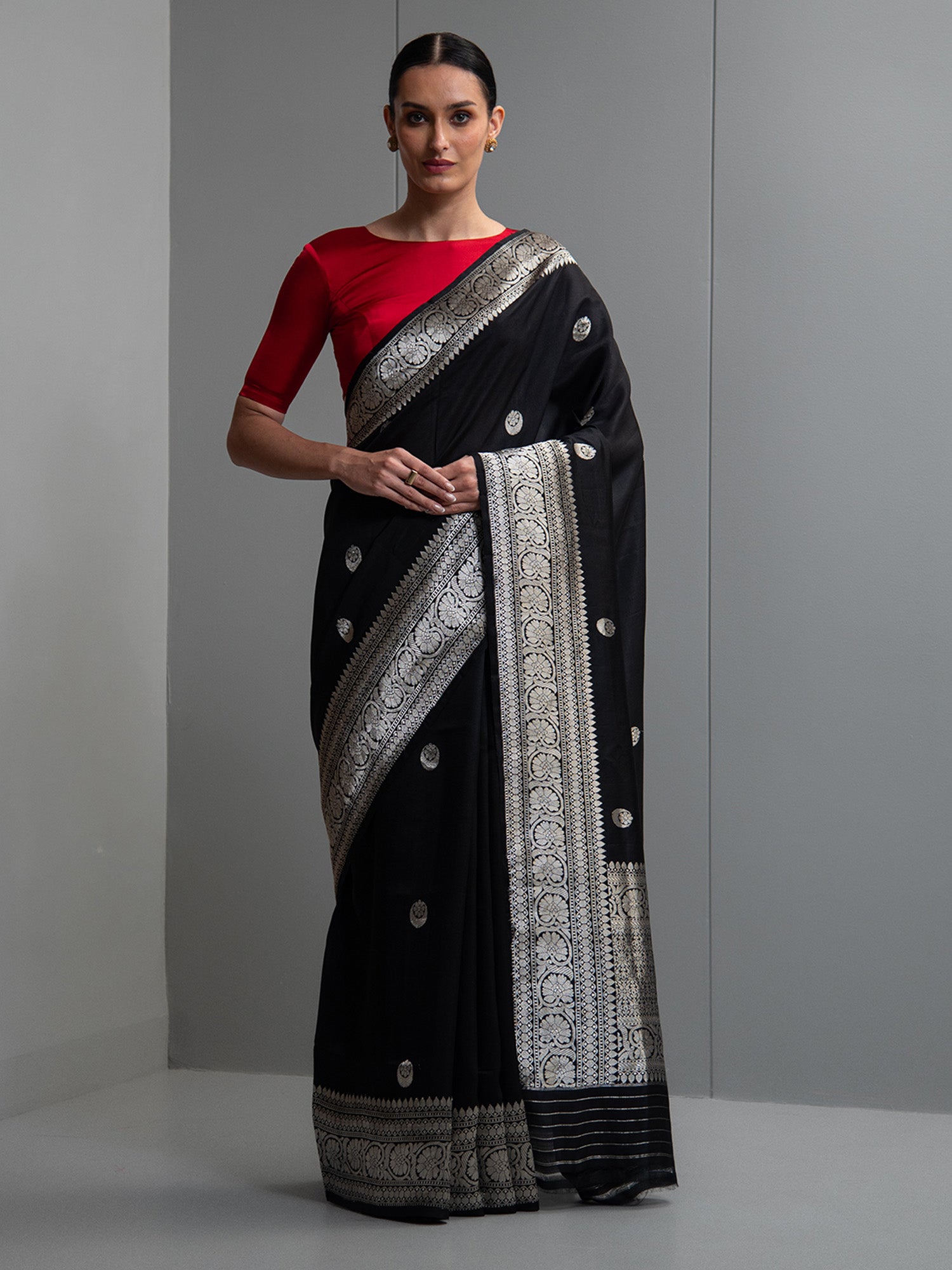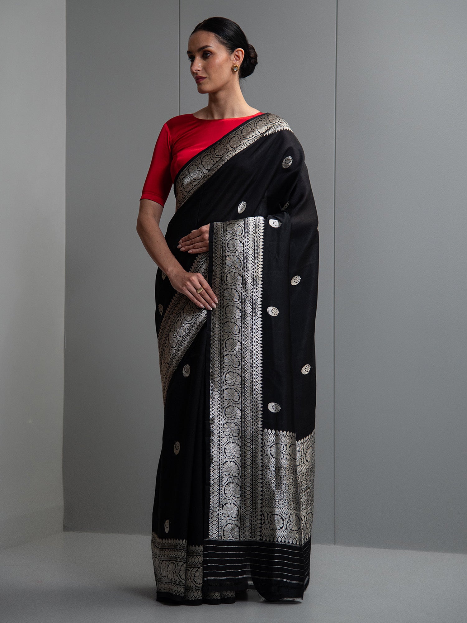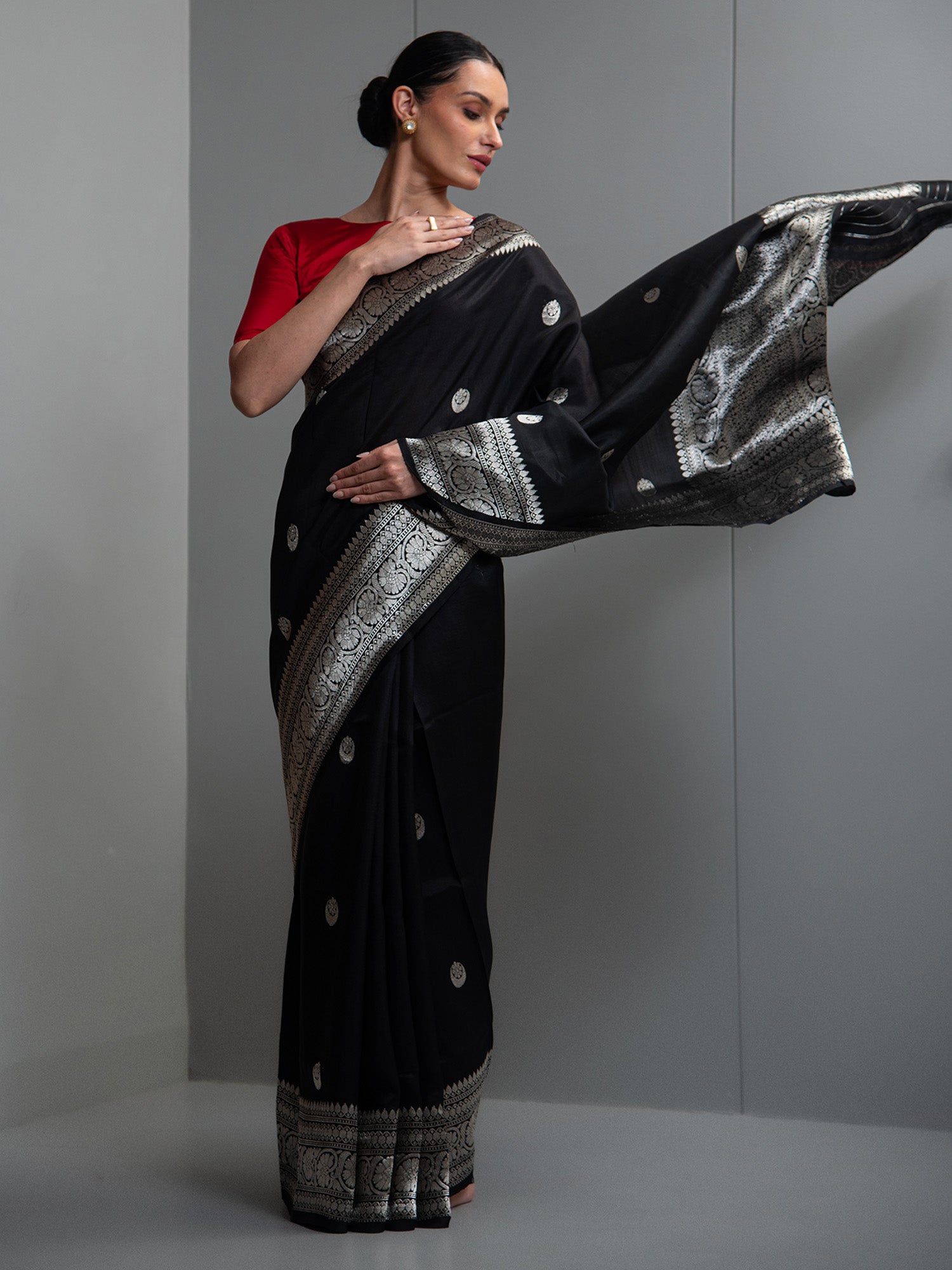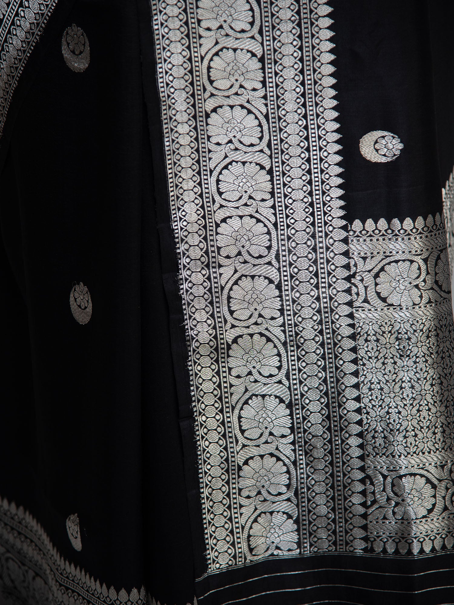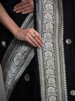 One of our stunning saree in black color this season. It's a luxury to be passed on to Generations. Beautiful silver zari booti all over with intricate detailing adds glamour to the saree. Floral silver zari border and breathtaking pallu bring the best of Indian weaving heritage. It's an elegant classic handwoven luxury.
