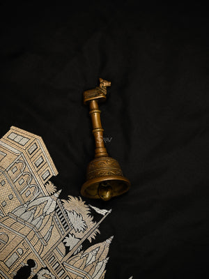 Discover Banarasi heritage in this handwoven saree in black Katan silk. Inspired by sacred ghats and temples, it features a serene minimal body with a striking, rich border displaying traditional sona-rupa zari work. Ideal for weddings and celebrations, this saree embodies authentic vintage Banarasi charm and craftsmanship, making it a treasured heirloom for those who value timeless elegance.