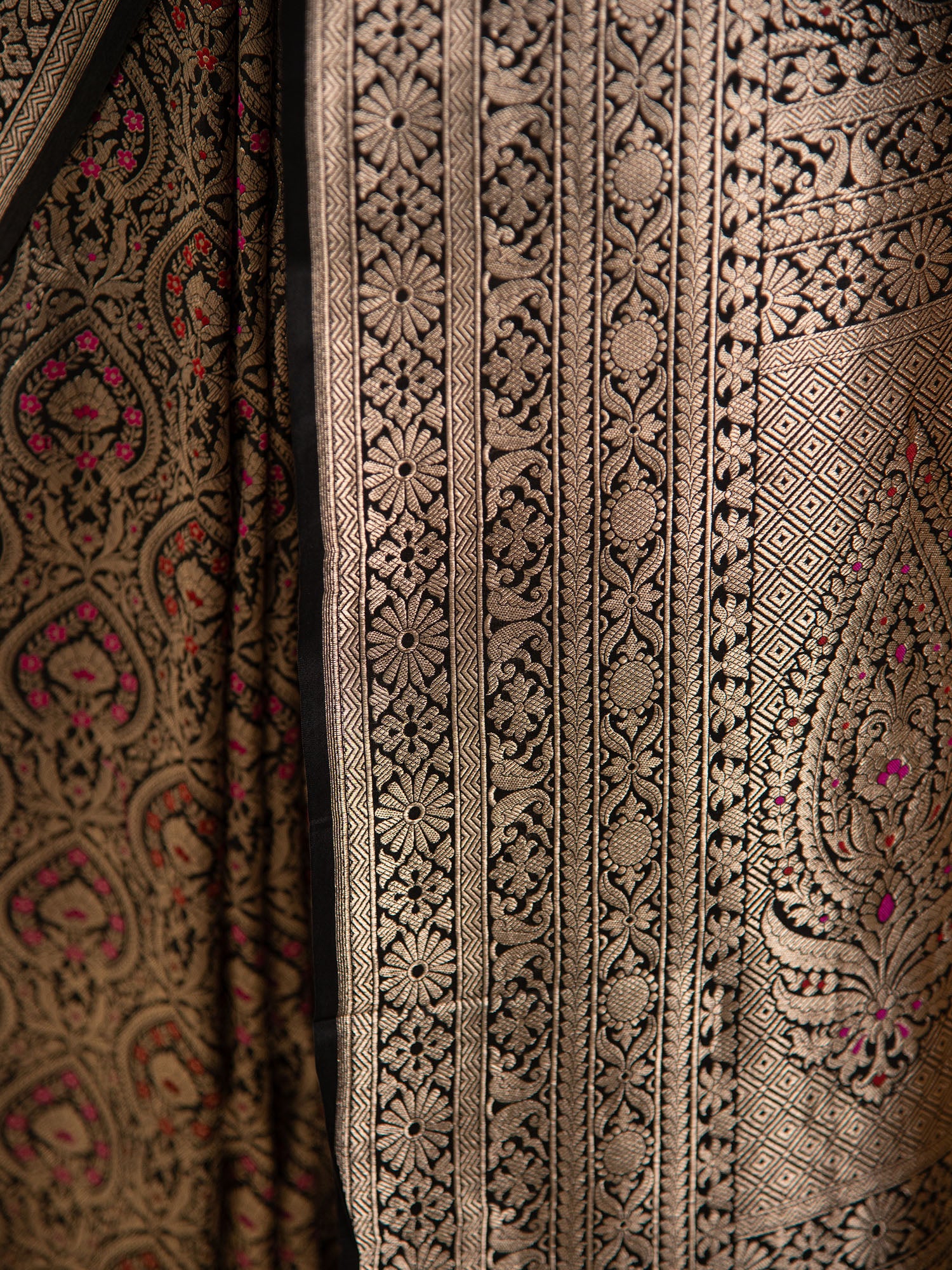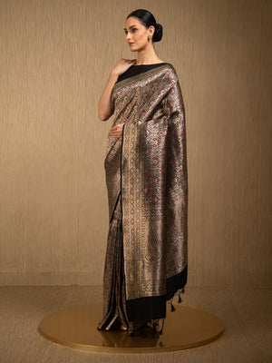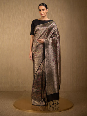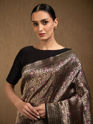 Directly crafted from the heart of Banaras, this Black Silk Brocade Handloom Banarasi Saree combines traditional artistry with modern elegance. Its soft brocade fabric offers effortless draping and lightweight comfort, making it an ideal choice for young women who appreciate timeless style with a contemporary touch. This saree’s rich texture and classic appeal make it perfect for both formal occasions and festive celebrations.