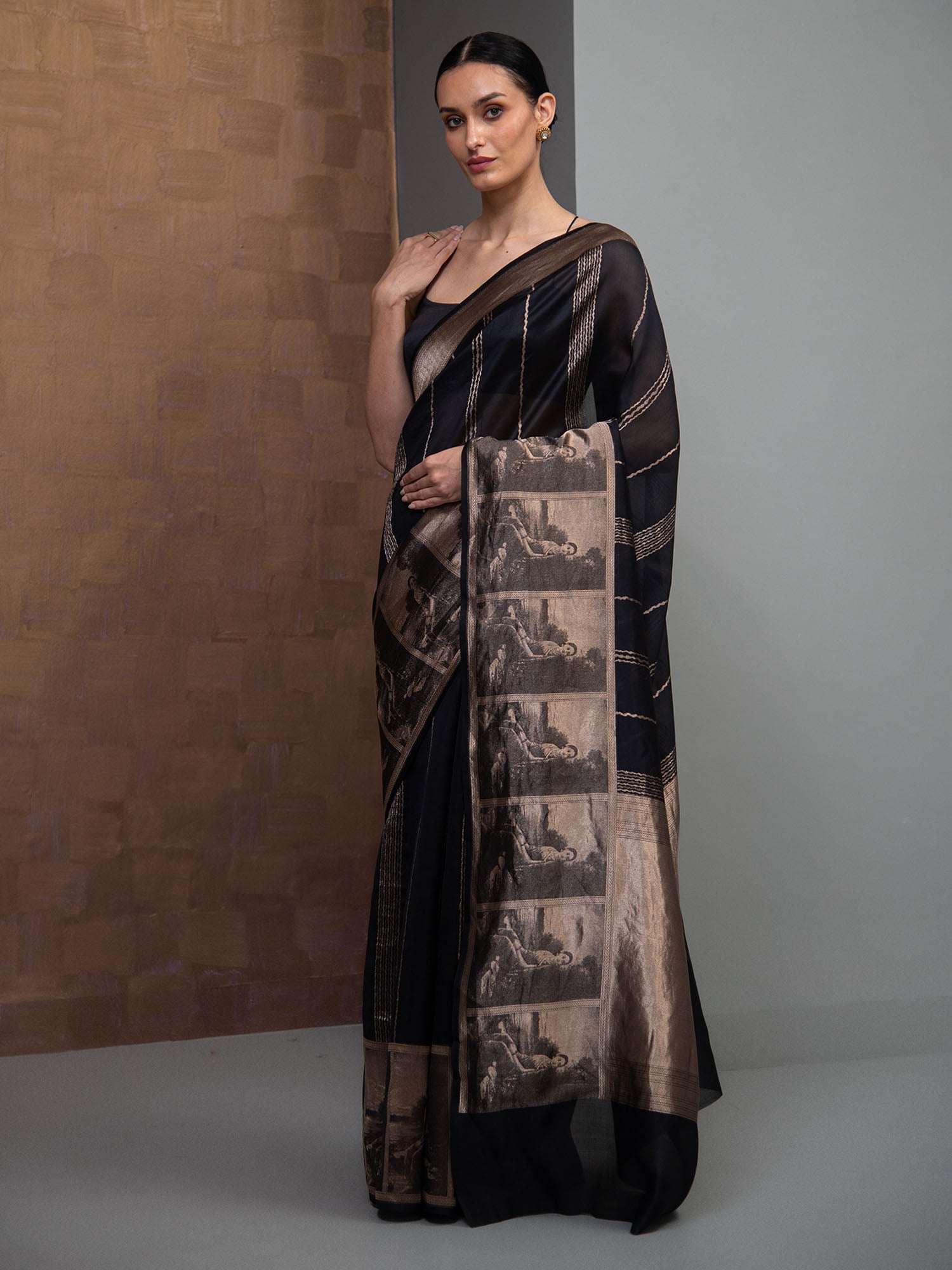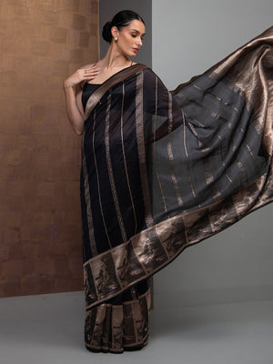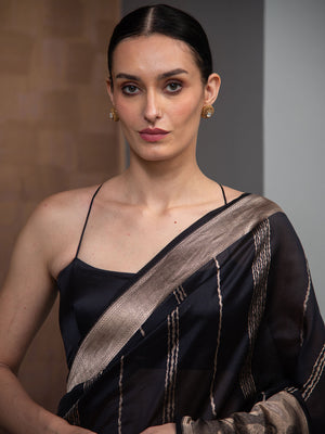 Directly crafted from the heart of Banaras, this Black Silk Banarasi Saree combines traditional artistry with modern elegance. Its soft fabric offers effortless draping and lightweight comfort, making it an ideal choice for young women who appreciate timeless style with a contemporary touch.