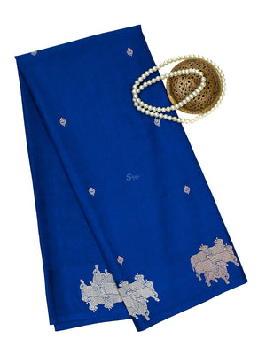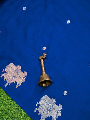 This elegant blue katan silk saree offers a lightweight and comfortable drape, making it an ideal choice for festivals and weddings. It features exquisite animal motifs along the border and a striking gold zari pallu, blending traditional craftsmanship with understated sophistication. The saree’s vibrant hues and minimalistic design create a graceful, refined look suitable for special occasions.
