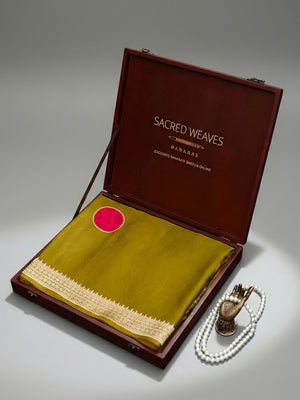 Drape yourself in luxury with this dark lime yellow satin silk saree, where rich velvet bootas ( woven with silk yarn) across the fabric. The gleaming gold zari border and ornate pallu create an air of celebration and sophistication. Each thread reflects authentic Banarasi weaving heritage, making this saree a treasured piece for your most cherished occasions and festive moments.