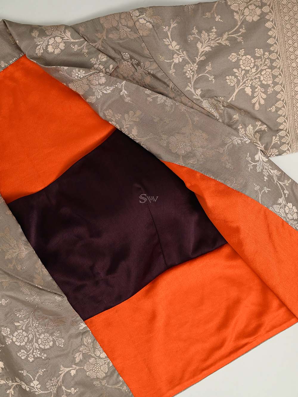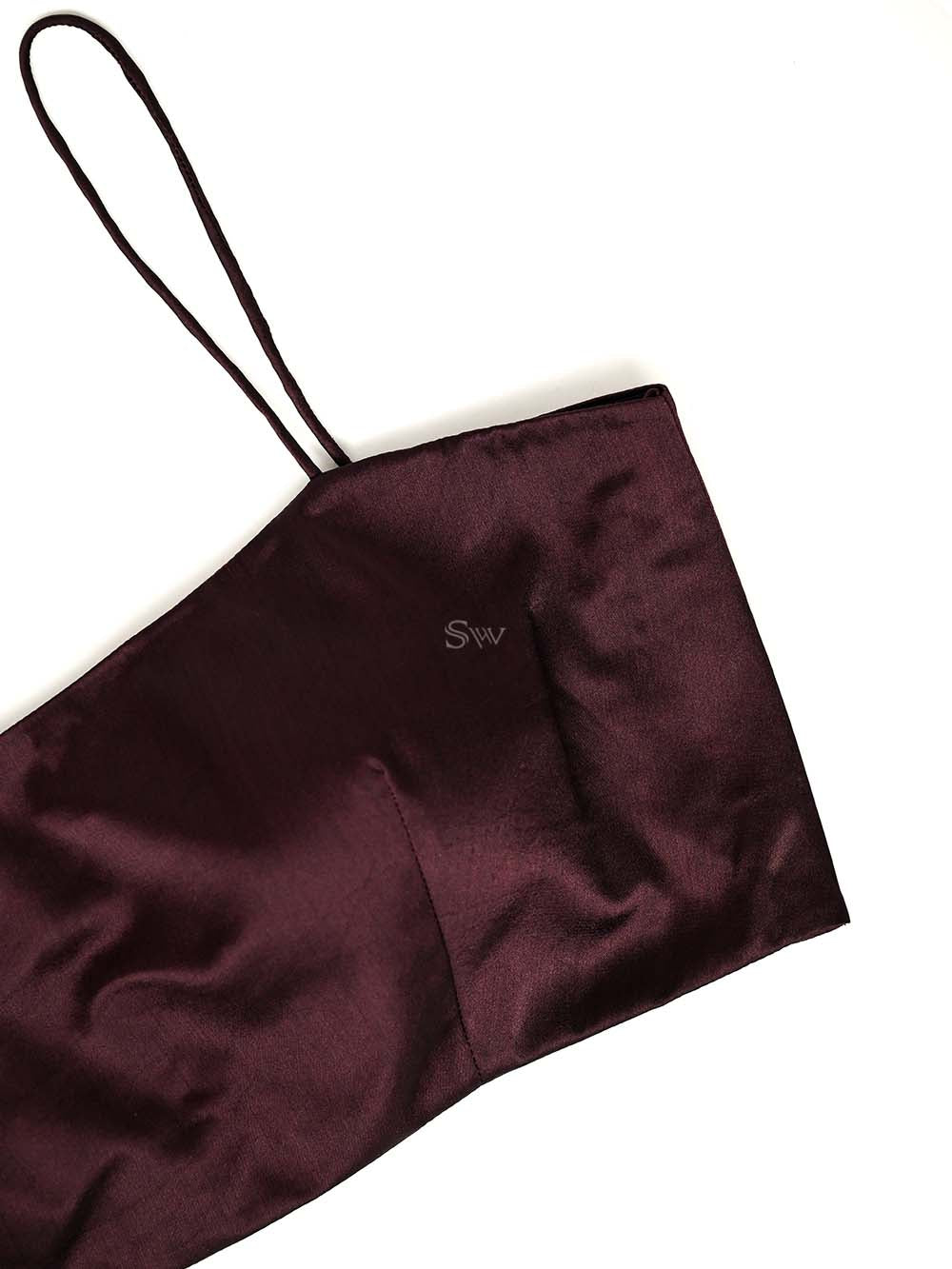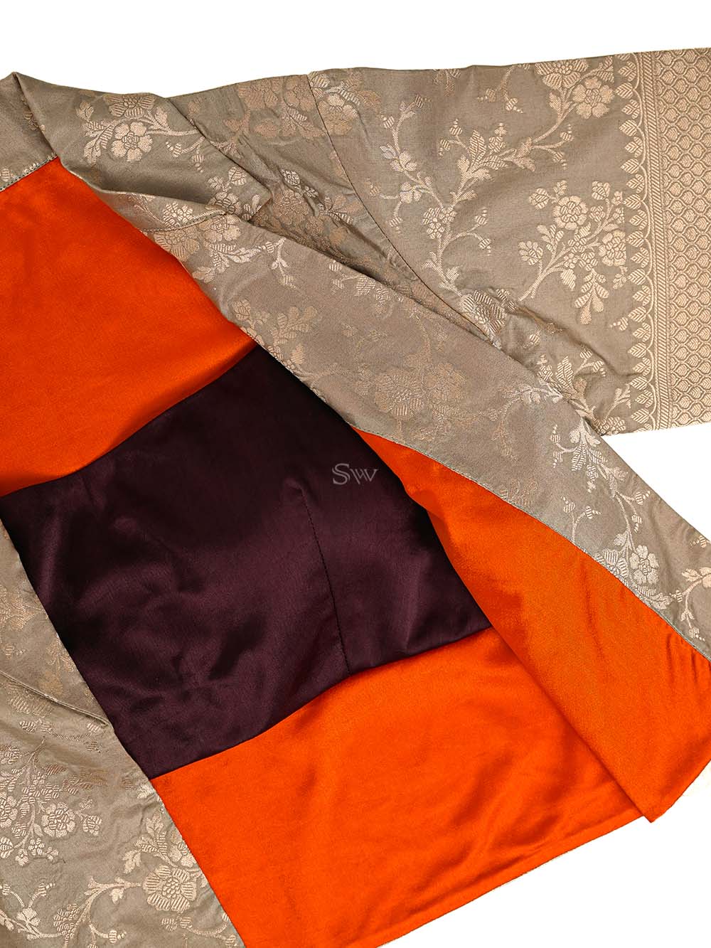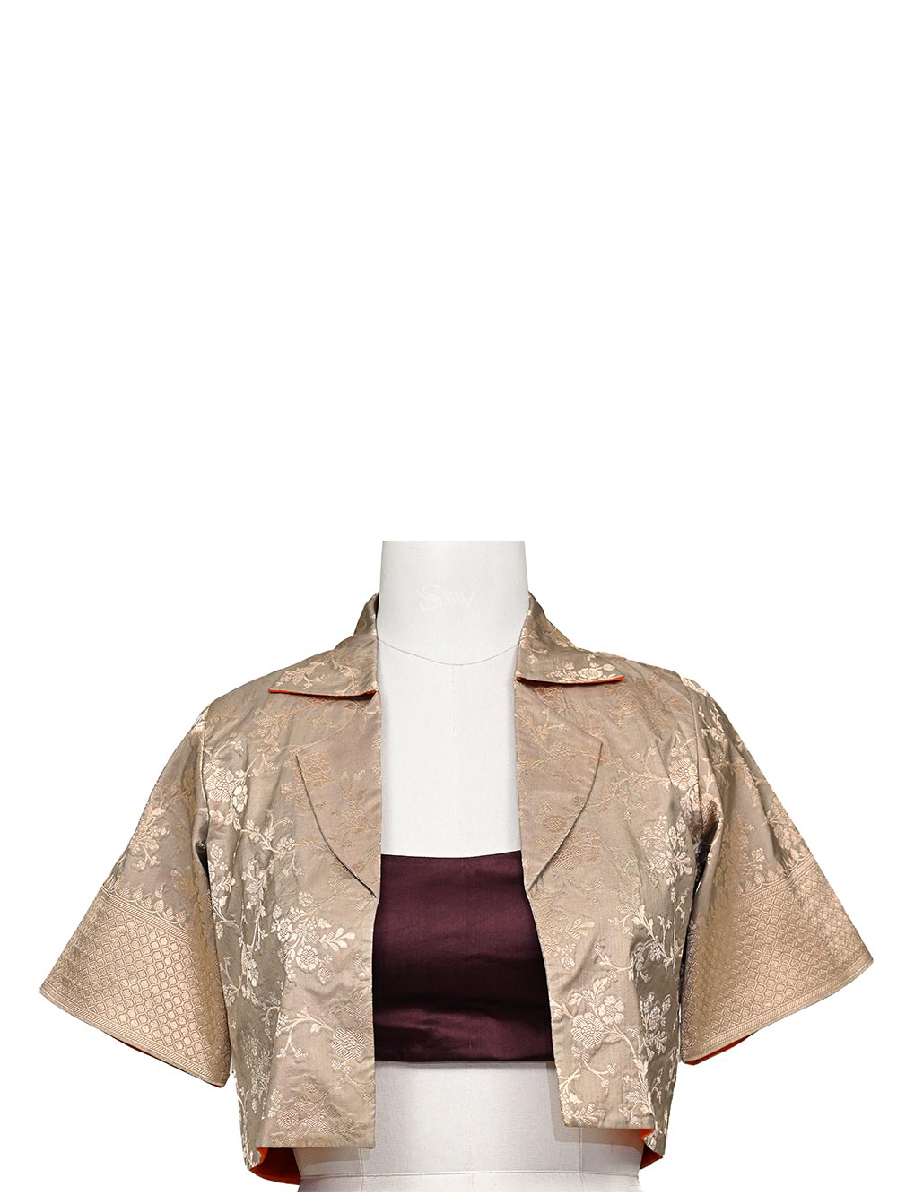 This contemporary crop top reimagines traditional Banarasi craftsmanship for modern youth. Luxurious silk features gold zari floral jaal patterns. The open-front jacket silhouette with short sleeves pairs seamlessly with a matching dark brown satin inner bustier. Ideal for festive celebrations and special occasions, blending heritage weaving with today's fashion sensibilities.