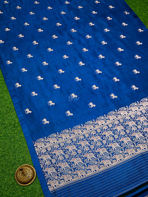 This elegant midnight blue katan silk saree offers a lightweight and comfortable drape, making it an ideal choice for festivals and weddings. It features exquisite animal motifs along the border and a striking gold zari meenakari pallu, blending traditional craftsmanship with understated sophistication. The saree’s vibrant hues and minimalistic design create a graceful, refined look suitable for special occasions.