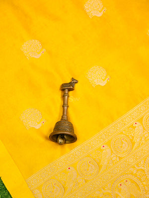 This elegant mustard katan silk saree offers a lightweight and comfortable drape, making it an ideal choice for festivals and weddings. It features exquisite animal motifs along the border and a striking gold zari meenakari pallu, blending traditional craftsmanship with understated sophistication. The saree’s vibrant hues and minimalistic design create a graceful, refined look suitable for special occasions.