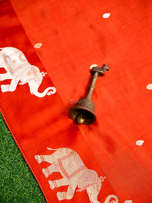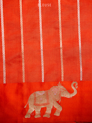 This elegant orange pure silk saree offers a lightweight and comfortable drape, making it an ideal choice for festivals and weddings. It features exquisite animal motifs along the border and a striking gold zari pallu, blending traditional craftsmanship with understated sophistication. The saree’s vibrant hues and minimalistic design create a graceful, refined look suitable for special occasions.