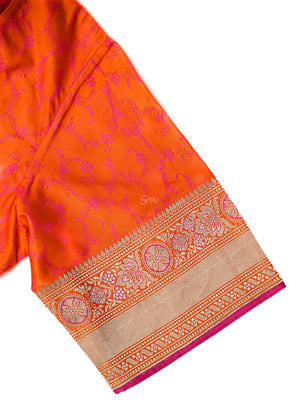 This contemporary crop top reimagines traditional Banarasi craftsmanship for modern youth. Luxurious silk tanchoi features resham floral jaal patterns. The open-front jacket silhouette with short sleeves pairs seamlessly with a matching dark pink satin inner
