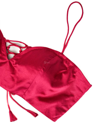 Disclaimer - Open-front jacket with dark pink satin bustier.
