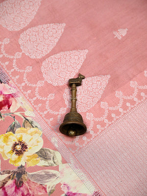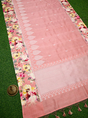 Pure tussar silk sarees by Sacred Weaves in peach color. It has a beautiful silver zari contrast digital broad border and silver zari booti all over. This charming handwoven tussar saree in the daintiest of hues and beguiling zari work is apt for all celebrations. The Saree looks stunning and captivating on the drape.