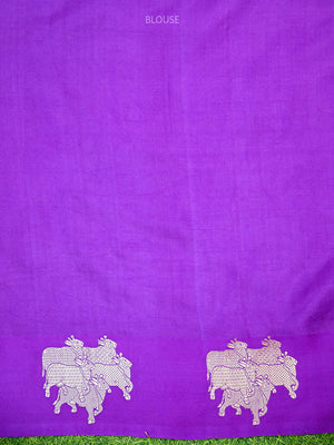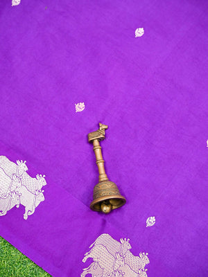 This elegant purple katan silk saree offers a lightweight and comfortable drape, making it an ideal choice for festivals and weddings. It features exquisite animal motifs along the border and a striking gold zari pallu, blending traditional craftsmanship with understated sophistication. The saree’s vibrant hues and minimalistic design create a graceful, refined look suitable for special occasions.