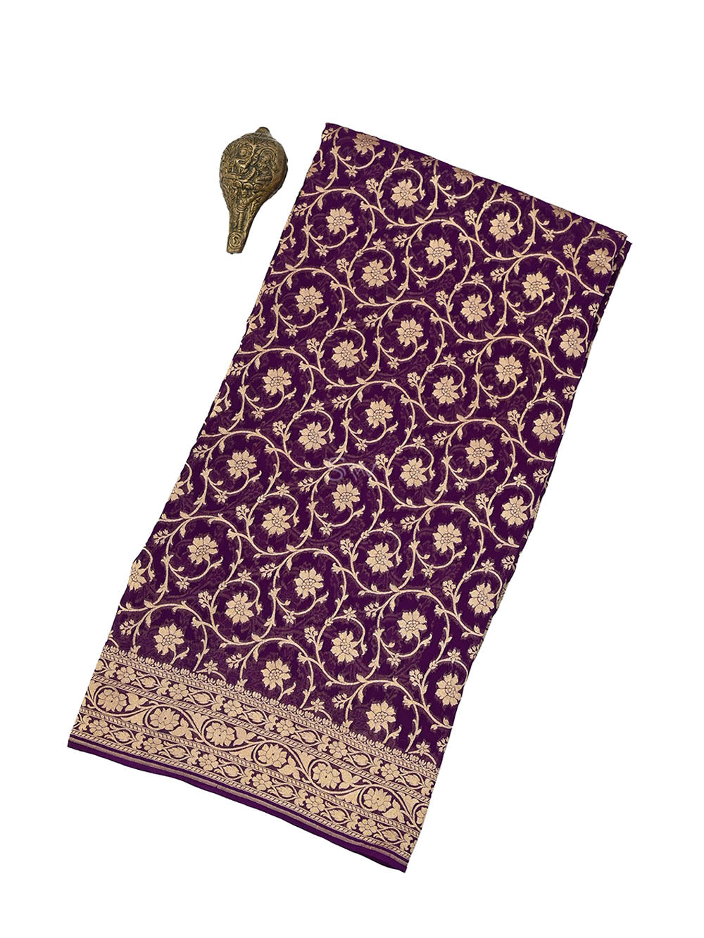 Purple color pure khaddi georgette saree. This saree has a beautiful gold zari floral jaal all over the body with a gold zari self border and pallu. It's an elegant classic handwoven Banarasi masterpiece. This free-flowing georgette saree gives a charming and alluring look to the drape.