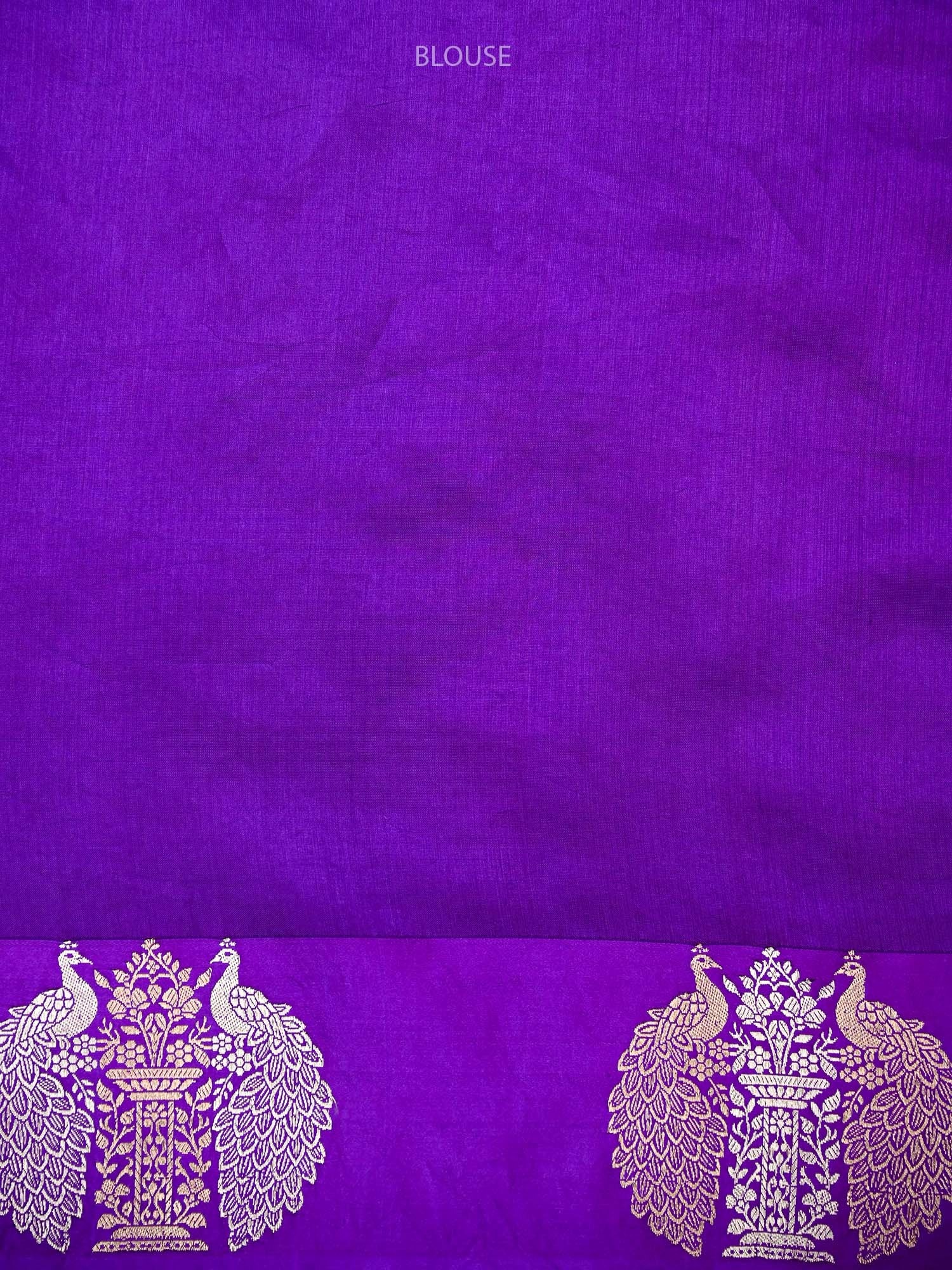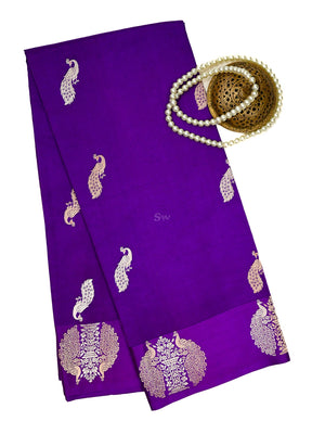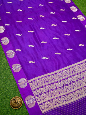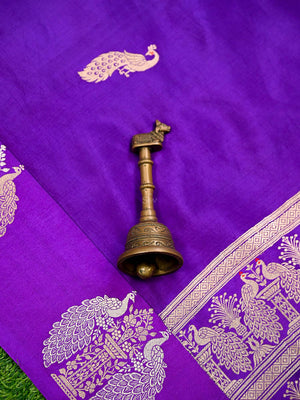 This elegant purple katan silk saree offers a lightweight and comfortable drape, making it an ideal choice for festivals and weddings. It features exquisite animal motifs along the border and a striking gold zari meenakari pallu, blending traditional craftsmanship with understated sophistication. The saree’s vibrant hues and minimalistic design create a graceful, refined look suitable for special occasions.