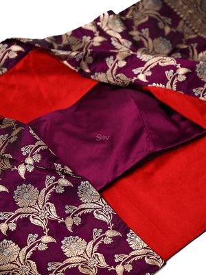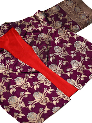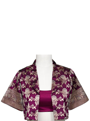 This contemporary crop top reimagines traditional Banarasi craftsmanship for modern youth. Luxurious silk brocade features gold zari floral jaal patterns. The open-front jacket silhouette with short sleeves pairs seamlessly with a matching purple satin inner