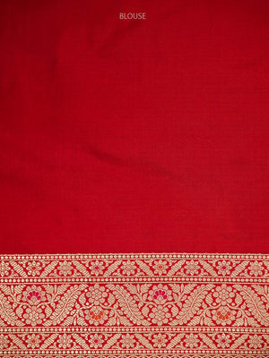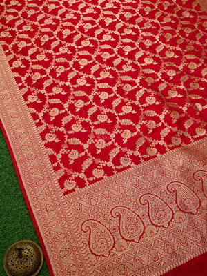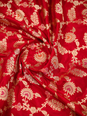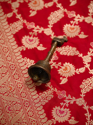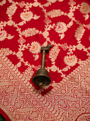 Authentic red uppada silk Banarasi saree featuring gold zari meenakari jaal work. This handloom masterpiece offers luxurious texture and traditional craftsmanship, making it ideal for weddings and special celebrations.