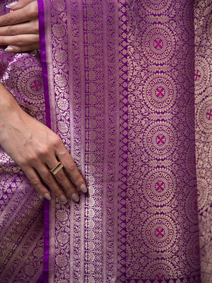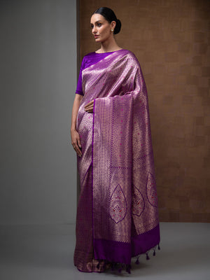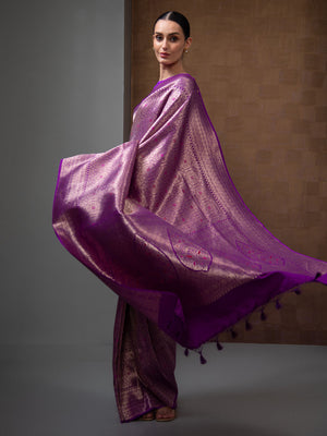 Directly crafted from the heart of Banaras, this Purple Silk Brocade Handloom Banarasi Saree combines traditional artistry with modern elegance. Its soft brocade fabric offers effortless draping and lightweight comfort, making it an ideal choice for young women who appreciate timeless style with a contemporary touch. This saree’s rich texture and classic appeal make it perfect for both formal occasions and festive celebrations.