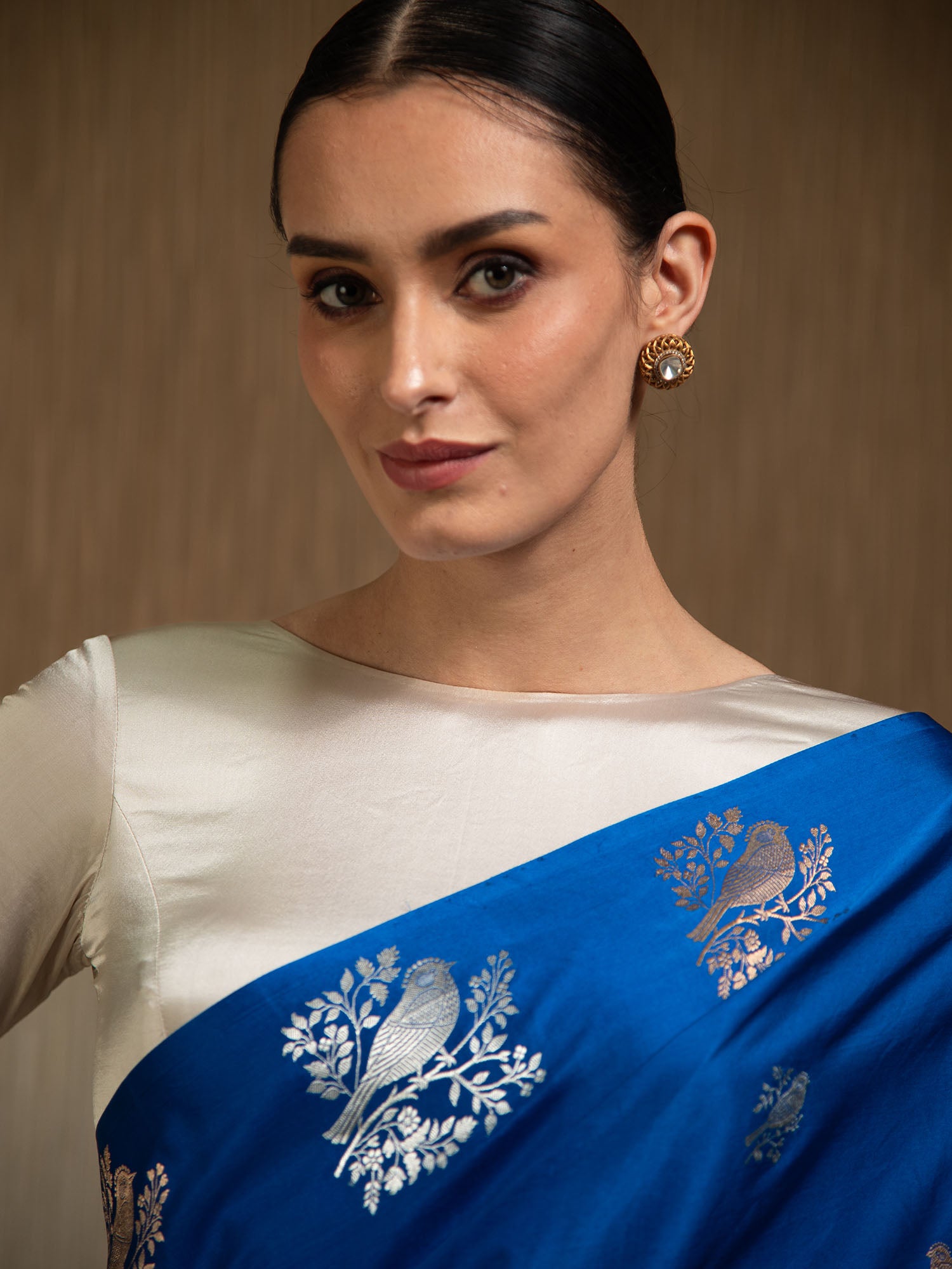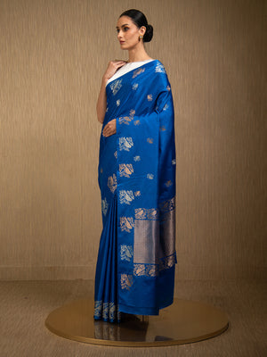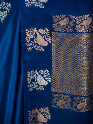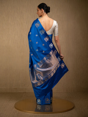 This elegant royal blue pure silk saree offers a lightweight and comfortable drape, making it an ideal choice for festivals and weddings. It features exquisite animal motifs along the border and a striking gold zari pallu, blending traditional craftsmanship with understated sophistication. The saree’s vibrant hues and minimalistic design create a graceful, refined look suitable for special occasions.
