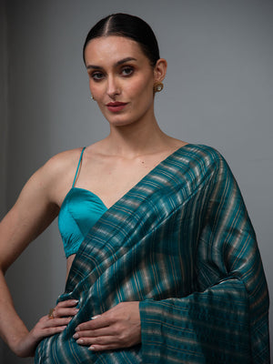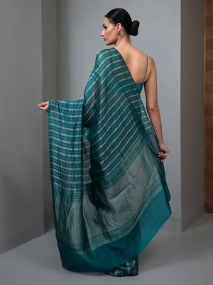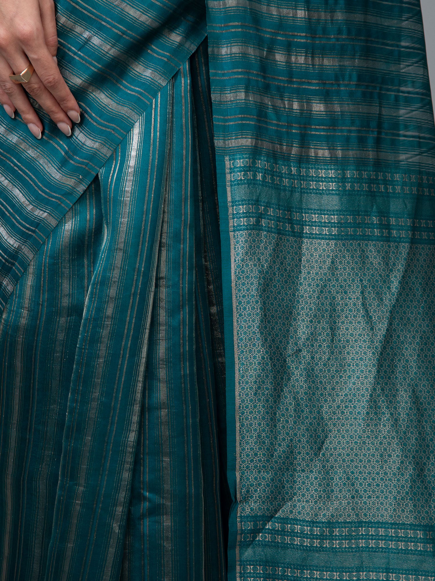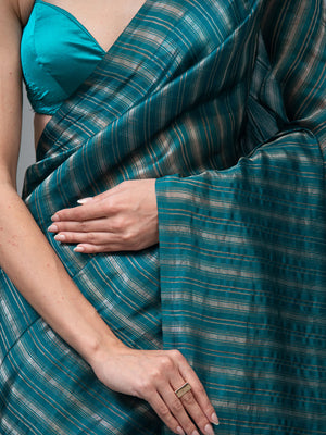 Teal Green Stripe Silk Handloom Banarasi Saree