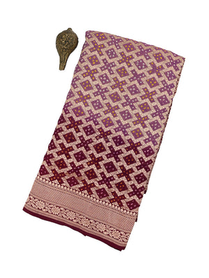 A dream in Banarasi georgette. Beautifully textured bandhani in wine mauve shaded. Saree is adorned with gorgeous gold zari jaal blended with tie and die technique. An age-old art from Rajasthan and Gujrat. Mesmerizing floral gold zari border and pallu look stunning and captivating on drape. An artistic match made in Banaras.